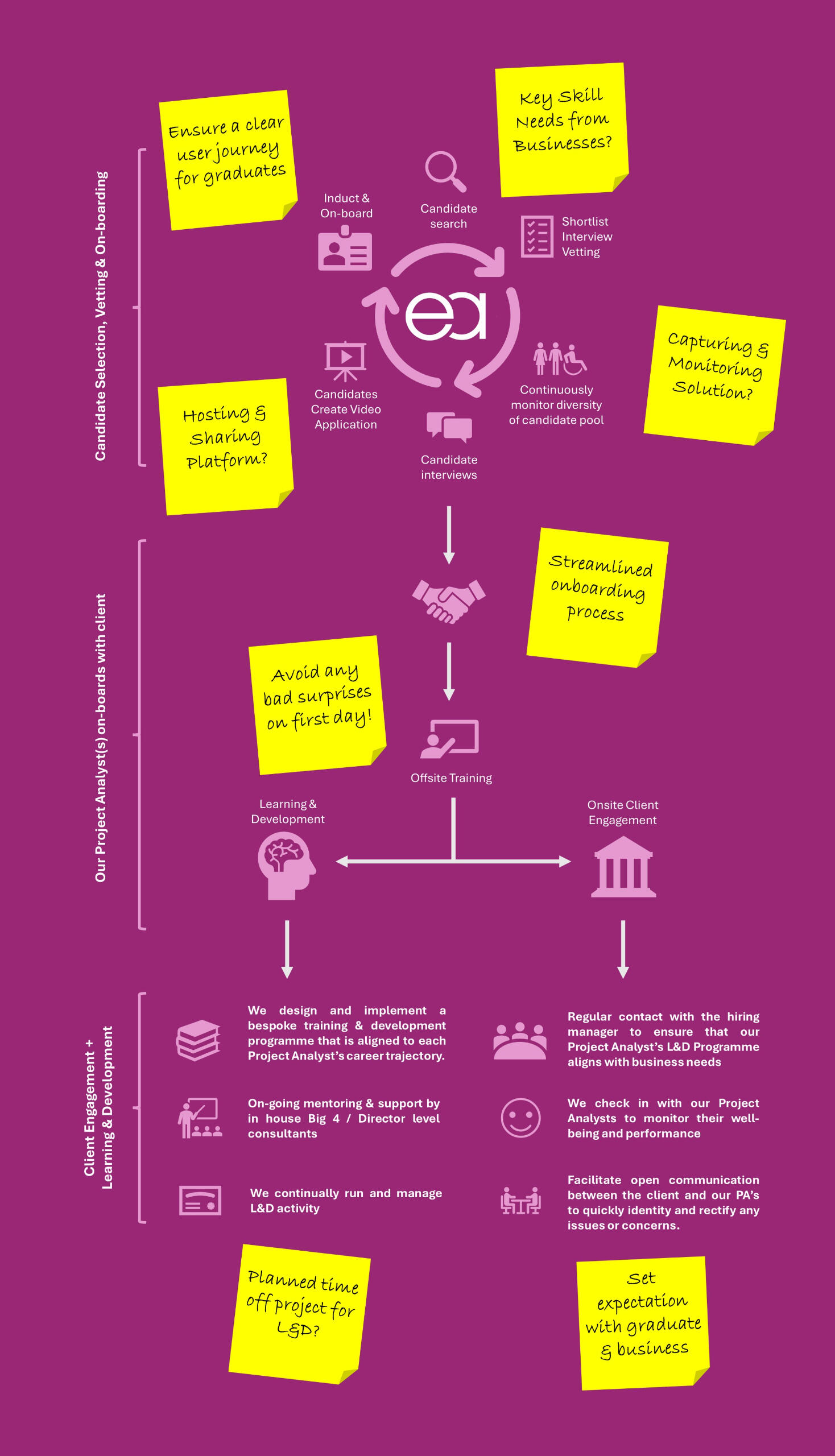 The primary user groups were graduates after exciting workplace opportunities, and clients looking to develop their long-term business change capability.For the service to be a success, we needed to ensure we met the expectations of both graduates and B2B clients, whilst solving each of their unique challenges, alongside analysing competition to help us develop a unique proposition.This helped us focus our offering - eaFutures wouldn't attempt to be a replacement for in-house graduate programmes, but rather a supplement. Internal schemes typically put graduates in rotation across operational areas, we would deploy them on clients' business change projects.I conducted user research with the two groups to draw out the key goals and issues - framing these priorities in the service design.